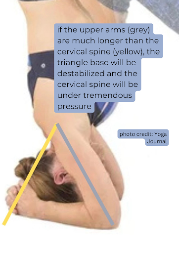 In a traditional Sirsasana (Supported Headstand), the weight is supposed to be distributed across a triangular base: the forearms (elbows) and the crown of the head.